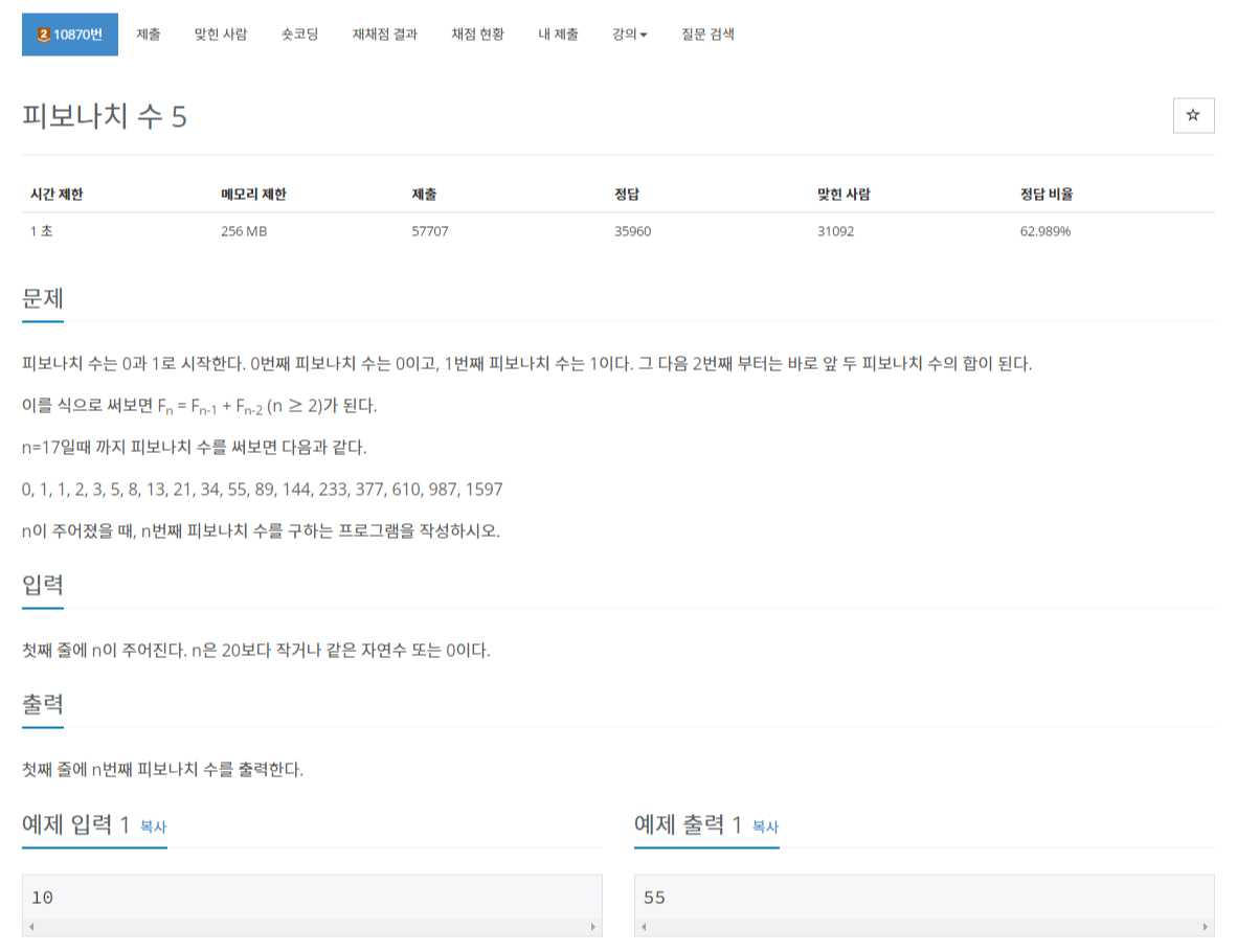 피보나치 수는 0과 1로 시작한다. 0번째 피보나치 수는 0이고, 1번째 피보나치 수는 1이다. 그 다음 2번째 부터는 바로 앞 두 피보나치 수의 합이 된다. 이를 식으로 써보면 Fn = Fn-1 + Fn-2 (n ≥ 2)가
