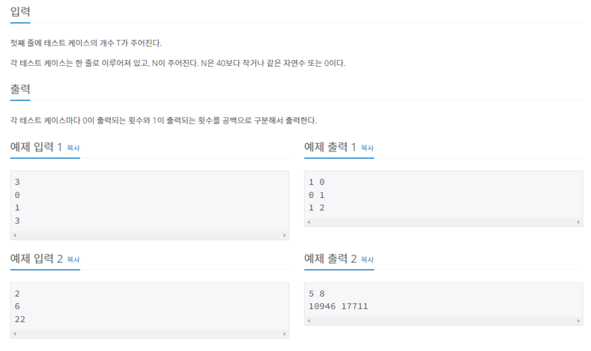 문제에서 n의 범위가 40이하의 자연수여서 이차원 배열의 범위를 int[41,2]로 설정했고, for문을 이용하여 모든 범위의 수에서 0, 1이 몇 개씩 들어가는지 배열에 넣었다. 그리고 테스트 케이스에 맞게 바로 출력했다.