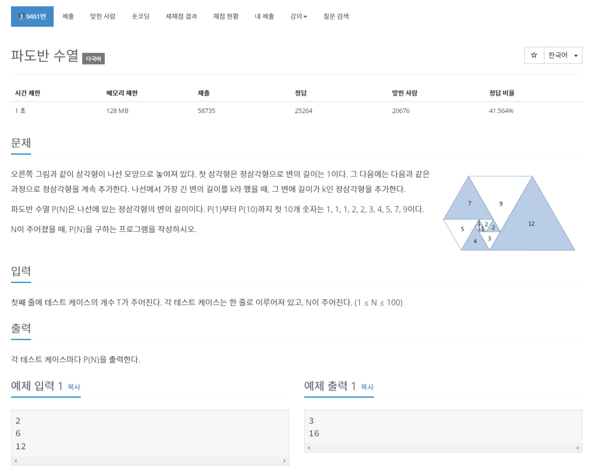 이 문제는 먼저 수열의 규칙을 찾아야 합니다. 우선 7번째의 삼각형인 4를 보면 2번째의 1과 6번째의 3의 변이 합쳐서 만들어진것을 확인할 수 있습니다. 또한 9번째의 7을 보면 8번째의 5와 4번째의 2가 합쳐져서 7이 되었죠!