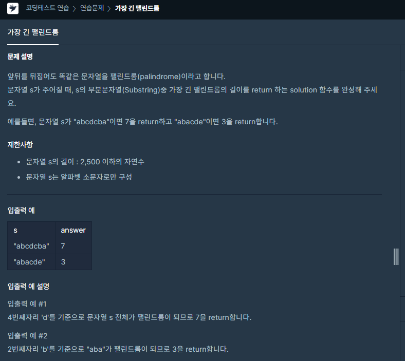 코딩테스트 연습 - 가장 긴 팰린드롬